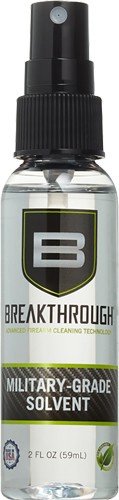 BREAKTHROUGH MILITARY GRADE SOLVENT is a premium cleaning solution designed for efficient removal of dirt, grime, and carbon buildup on firearms. Its advanced formula penetrates deep into the metal surfaces, ensuring a thorough clean without leaving any residue behind. The 2 oz bottle is compact and convenient for travel or storage. Say goodbye to lingering odors with this odorless solvent that delivers breakthrough cleaning results every time.