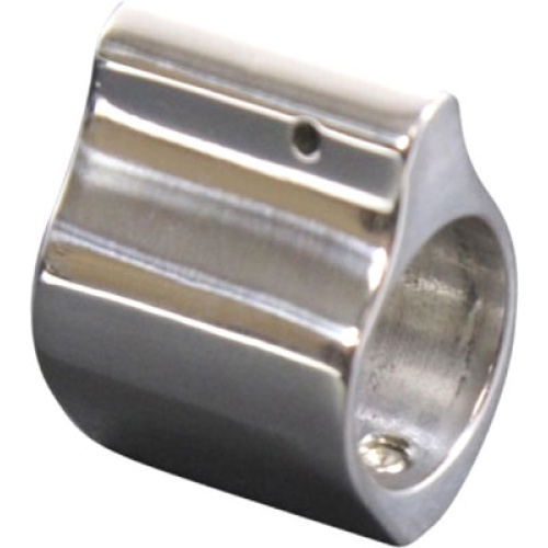 Low profile gas block for AR-15 rifles, made of polished stainless steel for durability and style.